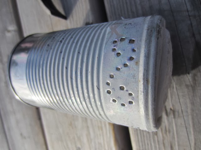Once everything was planned out I got started punching holes into the tin can. I was wearing gloves for a few reasons, first it is the end of October and second the frozen can was really cold!